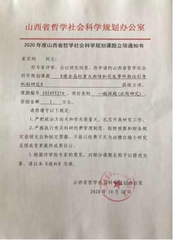 10月30日,由我部裴京娟副教授申报的《健全高校重大舆情和突发事件舆论引导机制研究》项目,获批山西省哲学社会科学规划课题立项,课题编号2020YY270,项目类别为一般课题(应用研究)。