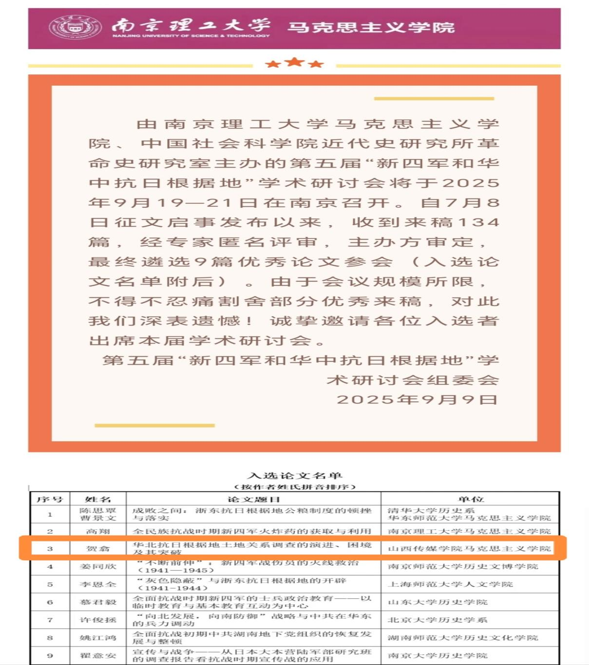 我院教师贺翕提交的论文《华北抗日根据地土地关系调查的演进、困境及其突破》入选研讨会,应邀作会议交流发言。“新四军和华中抗日根据地”学术研讨会已连续举办五届,为全国各地学者搭建了高质量的交流平台,形成了显著的学术品牌效应。随着研究共同体的成熟与壮大,这一系列研讨会必将为深化新四军和华中抗日根据地史研究、弘扬“铁军”精神提供重要的学术支撑。