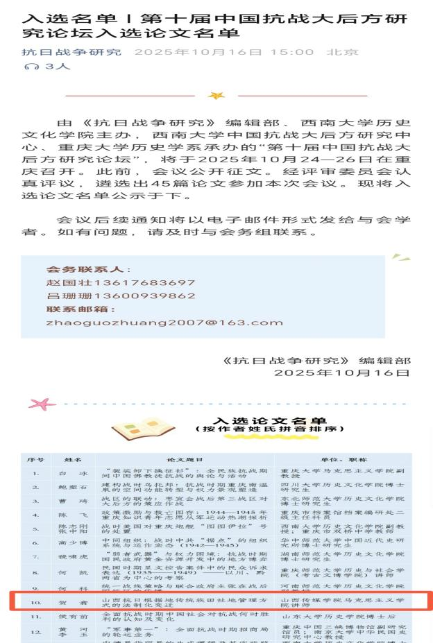 我院教师贺翕提交的论文《华北抗日根据地传统族田社地管理方式的法制化变迁》入选论坛,并应邀作交流发言。